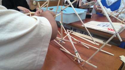 今日の図工は、わりばしをどんどんどんどん思い思いにつないでいきました。