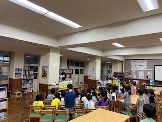雨降りということもあり、図書室には多くの児童が集まり、静かに図書委員さんの読み聞かせを聞いていました。