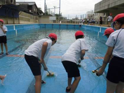 全校のみんなのために、一生懸命プールの中を磨いてくれました。