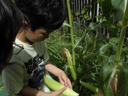 トウモロコシのひげが下まで茶色になったので、ついに収穫しました! トウモロコシを植えた本数が少なく、うまく受粉しなくて、1本だけの収穫となりましたが、ろ組のみんなは大満足です!