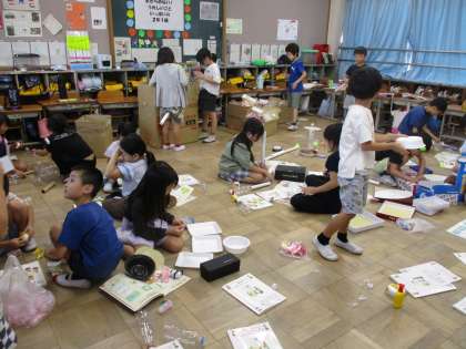 生活科の学習でペットボトルや卵パックなどの空き容器を使って、おもちゃ作りを行いました。お友達と相談したり、いろいろな工夫をして、おもちゃを動かしたりと、楽しみながら活動している様子でした。