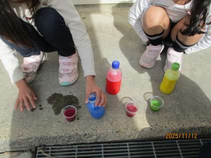 今日は、図画工作科の学習で、色水遊びをしました。色々な色の水を混ぜて、自分だけの色水を作りました。