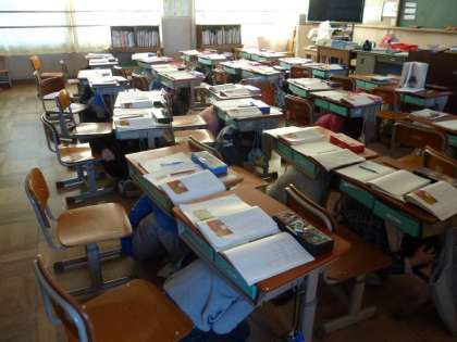 15日(水)に地震による避難訓練を行いました。京都に大きな地震が発生したことを想定して、まず身を安全に守るために机の下に隠れました。揺れがおさまり、全員体育館に避難しました。子どもたちは「お・は・し・も・て」の心構えを実行し、静かに早く体育館に集合しました。先生のお話もとてもいい姿勢で聞いていました。今日の訓練をいざという時に役立ててほしいです。