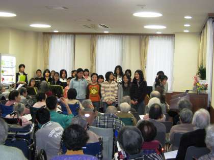 13日(土)の午後、部活動の音楽部の子どもたちは、校区にある特別養護老人ホーム「ヴィラ稲荷山」に演奏に行きました。多くのお年寄りの方が見に来られて、子どもたちは今まで練習してきた成果を発揮していました。曲目は笛の演奏で「風にのせて」「ふるさと」、合唱で「ふるさと」「さくら」を歌いました。「ふるさと」ではお年寄りの方も大きな声で一緒に歌いました。最後にアンコールをもらい、会場のみなさんで「ふじ山」を歌いました。子どもたちの歌声でお年寄りの方も少しでも元気をだしてくださるとうれしいです。