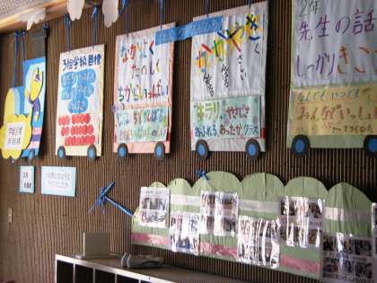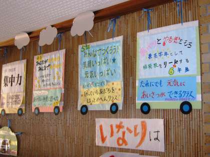 毎月各学級で月目標を決め、子どもたちの玄関に掲示をしています。毎朝登校して来た時に目標を見てがんばろうという気持ちを持ってくれればという思いで行っています。3月は1年間の締めくくりなので「1年間どのようなクラスでしたか」という目標を掲示しています。ろ組「みんななかよく 元気もりもりでがんばったクラス」1年1組「じぶんたちでがんばる ともだちいっぱいたのしいクラス」1年2組「キラりやさしさあふれるあったかクラス」2年「なんでもいつでも みんなでいっしょにとりくめたクラス」3年「みんなのために 一人一人ががんばったクラス」4年「助け合い仲良く遊んだクラス」5年「いつでもどこでも困っている友だちをほっとかへんクラス」6年「だれにでも元気にあいさつができたクラス」が各学年クラスからでました。新しい学年学級でも1年間いいクラスを作ってほしいです。