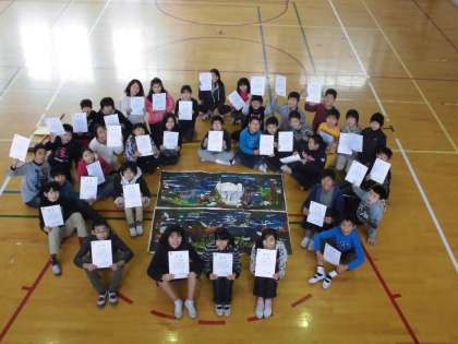 6年生で版画の共同作品に取り組みました。石峯寺ゆかりの伊藤若冲の『鳥獣花木図屏風』を一版多色で刷りました。一枚一枚の色合いを合わせるところが難しかったです。仕上がった作品はコンクールで入選しました!全員で作ったので,みんなが賞状をもらいました!