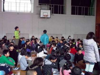 今,教師塾生(将来教師を目指して学んでいる大学生)が,火曜日と木曜日の週2回,計10回の予定で来校しています。その方は,福島県北部のご出身で東日本大震災を体験されました。その体験を子どもたちにぜひ伝えたいとお話しいただきました。