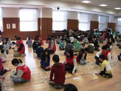 個人戦と団体戦があり,どの子も日ごろの練習の成果を発揮していました。今年は大会史上初めて個人戦の決勝に本校の児童が残りませんでした。個人戦優勝と準優勝は伏見南浜児童館の子どもたちでした。団体戦の決勝は,「なのはな」チームと「ミント」の2チームで,どちらも本校5年児童のチームでした。25枚対20枚の白熱した戦いで,「なのはな」チームの優勝でした。