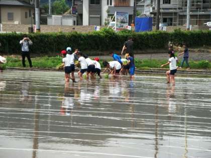 自然豊かな嵯峨野地域の田んぼに入り,参加者一人一人が心を込めて丁寧に苗を植えることができました。秋の稲刈りの時にはどれくらいの高さに生長しているのでしょう。