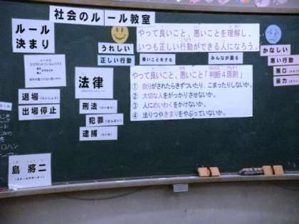 「ルールはなぜ作られているのだろう」についてスポーツでも退場や出場停止があること,世の中では,罪を犯せば逮捕されるなど刑法という法律があることなどを学びました。