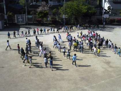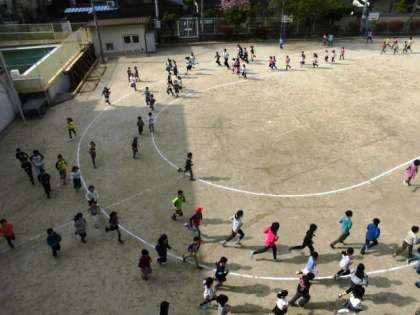 全校児童が,毎朝運動場を5分間走っています。
