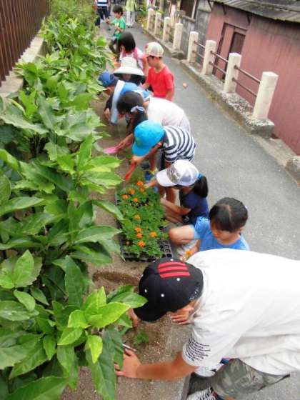 1年生から6年生までの40名近くの子どもたちと保護者の方々も交え,地域の花の達人酒井さんのご指導のもと,学校周りの花壇に花の苗を植えました。
