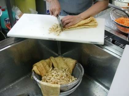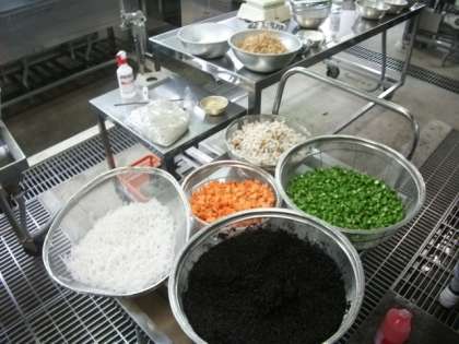具材を大量に切ったり,大きな釜で炒めたりしています。