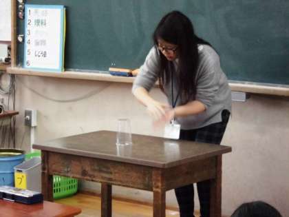 ALTのラウ・カヤン先生の自己紹介,カップを使ったパフォーマンスの後,子どもたちも自己紹介です。