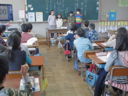 国語の4年生としての学習が始まりました。今日は「聞きとり名人」を目指しての第一歩。一つの言葉をばらばらにし、一人が一音ずつ担当して一斉に言われたものを、聞き取ってあてるという活動でした。3人グループは三音のことば、4人グループは四音のことばでやりました。当然四音の方がむずかしいと思うのですが、意外に三音が聞き取れなかったりして、みんなお互いの出し合った言葉に集中して耳を傾けていました。ばっちり正解を答えた子達のうれしそうな表情がかわいらしかったです。