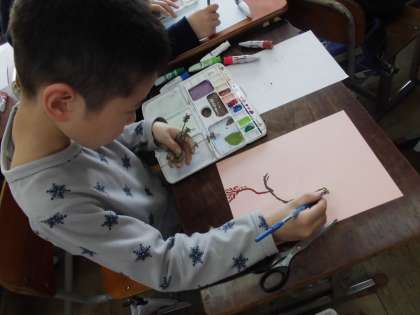 はじめは直接絵の具で描くことにちょっと心配気味の様子でしたが,描き進むうちに微妙な色の変化に気づいていく子達もいて,どの作品も味わいのある作品が完成しました。来週はここに春になった今の思いを短い文でそえようと思っています。