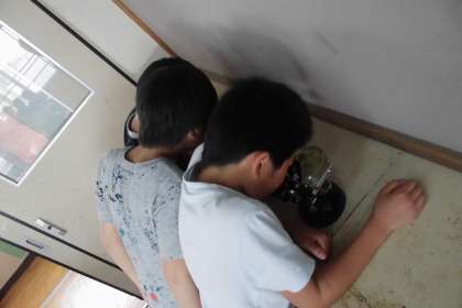 生き物に興味津々な子たちが熱心にのぞいています。