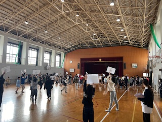表彰式やいなりっこたまごの発表のあと、稲荷山巡りに向けて、縦割り活動が行われました。各グループで高学年の児童が、下の学年を丁寧に教える姿が見られました。