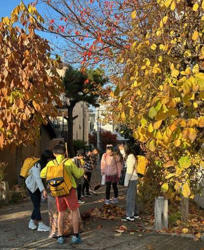 登校してきた子どもたちが、落ち葉をお掃除する管理用務員さんのお手伝いをしていました。
