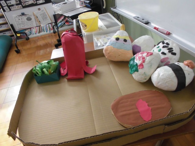 「小さな巨匠展」の共同制作のために深草小学校へ行って来ました。深草中学校ブロックでは、みんなで大きなお弁当を作ることになりました。深草小学校のお友だちと力を合わせて、ハンバーグや唐揚げなどを作ってきました。仕上がったら大きなお弁当箱に詰める予定です。出来上がりが楽しみです。