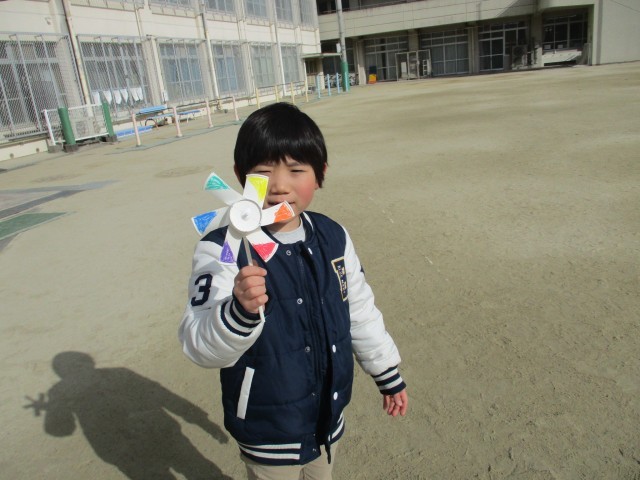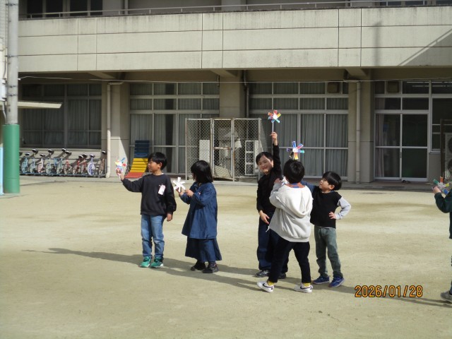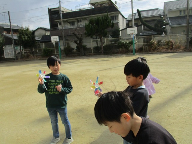 生活科では、「ふゆとともだち」という学習をしています。今日は、紙コップで風車を作って、校庭で楽しみました。