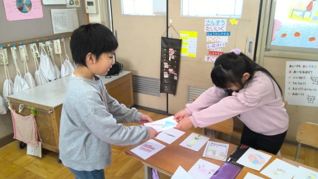 今日は、国語科で学習したことを生かして、お店屋さんを開きました。色々なお店屋さんが開店して、とても楽しかったです。お店の人とお客さんの会話も色々で、おすすめの品物を聞いたり、逆にお店の人がおすすめしたりと、ただ「売る」「買う」だけでなく、様々な会話が生まれていました。買い終わった後には、「お気をつけて~」「またのお越しをお待ちしております」「違う商品を揃えて、お待ちしています」「また買いに来ますね」など、最後の最後まで会話を楽しんでいました。