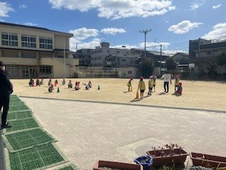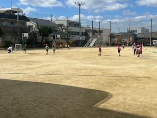 子どもたちは「ボールけりゲーム」の学習で、先生の指示をしっかりと聞き、お互いに声をかけ合いながら、友だちと協力して活動する姿が見られました。
