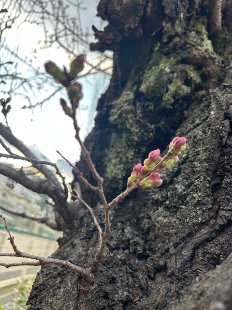 来週に卒業式を控えた今日、校庭の桜の木にピンク色を覗かせた蕾を見つけました。