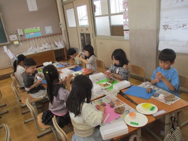 図工の時間にねんどでごちそうを作りました。前の時間に考えたごちそうを夢中になって作っていました。お寿司や餃子、ペロペロキャンディーなど、おいしそうなごちそうがたくさん出来上がっていました。