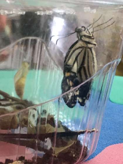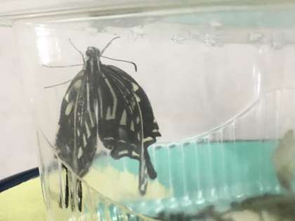 先週にさなぎになっていたアゲハチョウでしたが・・・。気がつけば・・・、羽化しました!感動の瞬間は・・・。箱を持って移動中に・・・。担任の先生だけが目撃してしまいました。