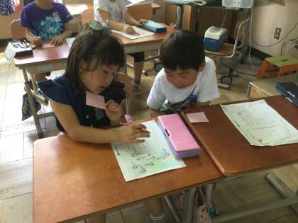 「生き物ランド」で書いた観察カードを使って交流しました。