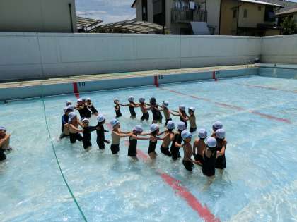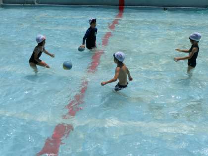 今回は,みんなで「でんしゃごっこ」を楽しんだ後,ペアで好きな遊びを選んでどんどん遊びました。自分たちで学習を進めていく「みずあそび」の学習にはやく慣れて,主体的にどんどん活動していって欲しいと思っています。