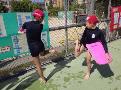 平泳ぎの足を教えています。「あおり足」にならないように,キックの仕方を説明しています。ナイスアドバイスですね!
