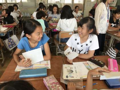 今日の外国語は,誰かになりきって尋ねられたことに答える練習です。「What is your name?」「When is your birthday?」「What color do you like?」などの表現を使いながら,楽しくやり取りしています。すてきな笑顔でコミュニケーションできていますね☆