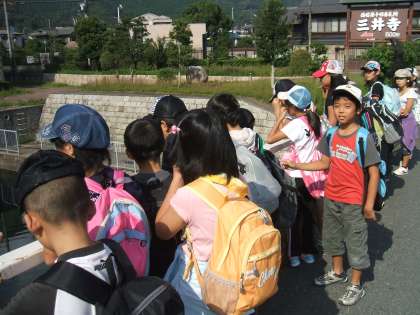 10月13日(水)にさわやかな秋空のもと,無事に遠足に行くことが出来ました。今回の遠足は,社会科の学習と関連がある「琵琶湖疏水」に行きました。京阪の浜大津駅で降りて琵琶湖沿いを歩きながら,まず疏水の取水口に着きました。琵琶湖から水を引いていることがよく分かりました。そこから疏水に沿って歩きました。レンガをつかった風情ある建物や昔の雰囲気を残す水門など,実際に行って見ないと感じられないものに触れることができました。小関という峠を越えた辺りでは,意外と?大きな「たてこう」も見つけることが出来ました。そして,峠を歩いているときには見えなかった疏水も山科で再会し,琵琶湖疏水記念博物館を見学した後でお昼ご飯になりました。公園では思いっきり体を動かして遊ぶことが出来ました。