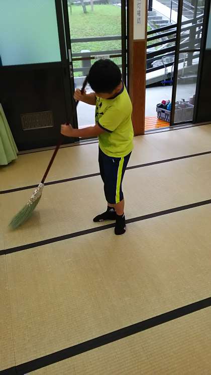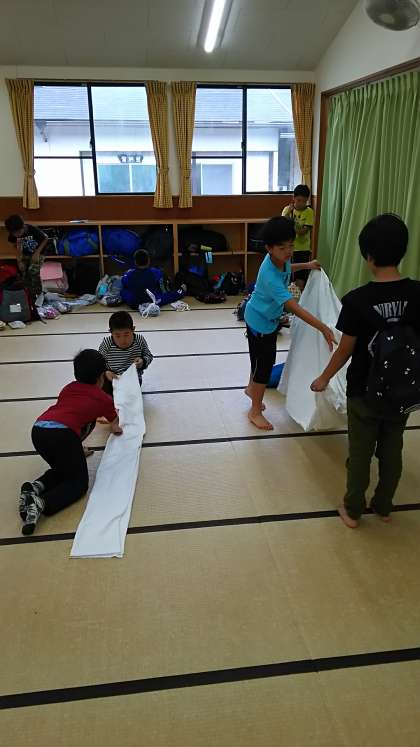 起きてきた子ども達はシーツをたたむなど寝具の片づけをしています。