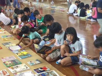 新しい本が体育館にずらりと並んだ様子を見て,きらきら目を輝かせる子どもたち。