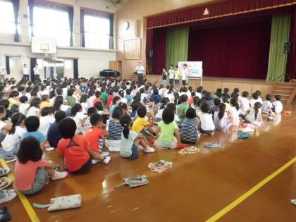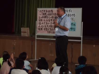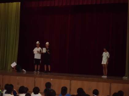 そのあとの児童朝会では、夏休みの過ごし方や安全について、寸劇をしながら注意をよびかけてくれました。