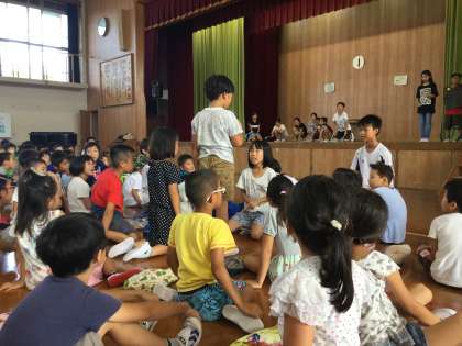 児童朝会では,運営委員会の5,6年生の「こんなとき,どうすればよかったでしょう?」という質問に,たくさん手を挙げる2年生でした。