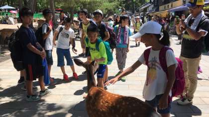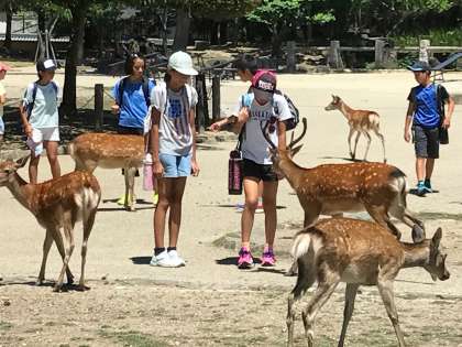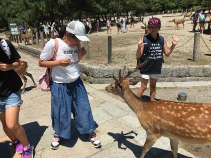 鹿せんべいをあげています。手をかぷっとかまれないかな…どきどきしながら手をのばしています。鹿さんたちと仲良くなれました☆