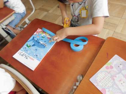 鉛筆やテープの長さを比べるためにこつを探しました。