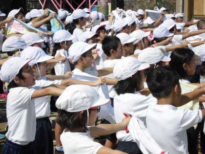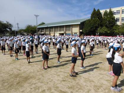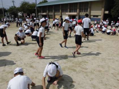 開会式の隊形に並んで全校ダンス(準備運動)の練習をしました。今日までに各クラスで練習してきているようで,はじめての練習と思えないくらいに上手にダンスをしていました。