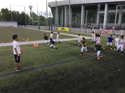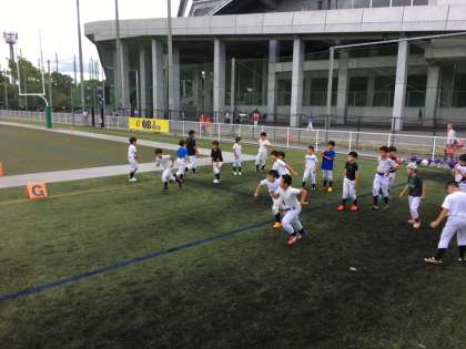大阪吹田市にあるエキスポフラッシュフィールドで18日(月・祝)にチェスナットリーグ(小中学校のアメリカンフットボールリーグ)第1戦が行われました。心配していた台風が過ぎ去り、少し汗ばむ天候の中の試合でした。