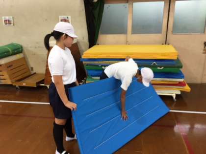 体育の学習で,マット運動をしています。学習カードを見たり,友達にアドバイスをもらったりしながら,できる技を少しずつ増やしています。準備や片づけもみんなで協力してできるところも,さすがです!!