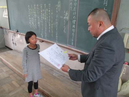 校長先生から賞状をもらいました。今回は図工の作品の賞状です。