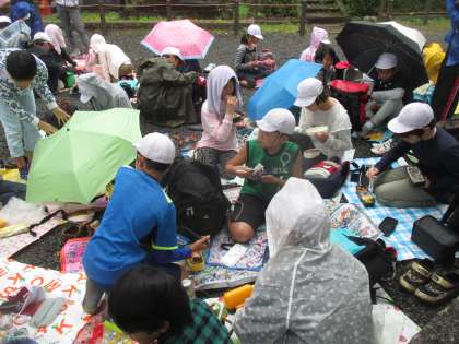 雨の中,合羽を着たり,傘をさしたりと大忙しの中,愛情いっぱいのお弁当を食べました。キャラ弁の多さにびっくりしました!!卵でご飯をくるんで,ミニオンを作っているのを見て,思わず「なるほど!!」