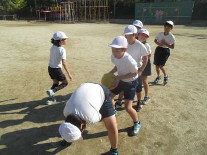 次は,ボールリレーをします。チームで協力して,ゴールを目指して進みます。