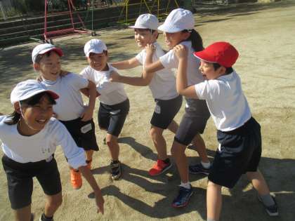 次は,ヘビのしっぽとりをしました。おにに蛇のしっぽをタッチされないように,チームで協力します。