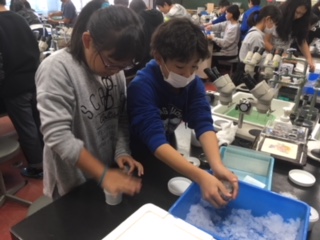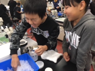 最後に,水の結晶をつくりに挑戦!がんばって結晶つくろ…って,氷が冷たい!
