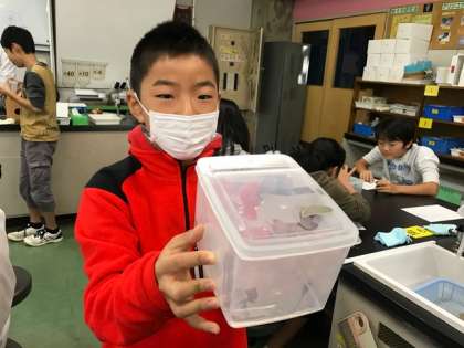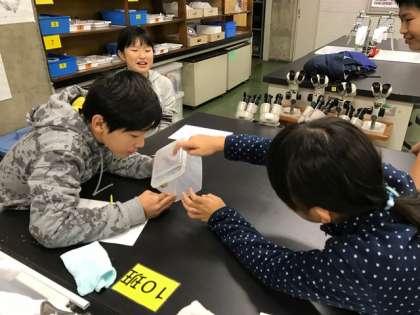 いよいよ来ました、かたつ無理〜。おそるおそるかたつむりを受け取って、観察がはじまりました。